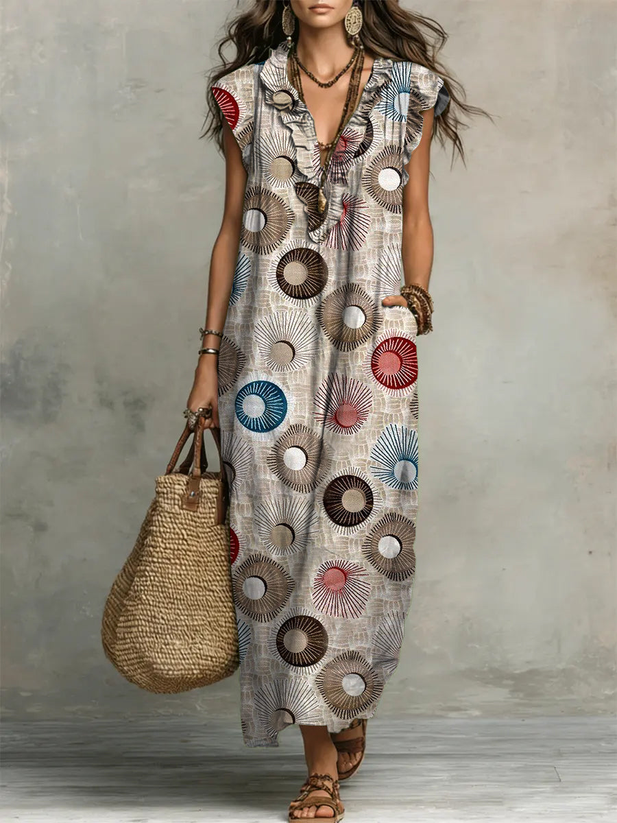 Women's Retro Geometric Pattern Art Print Casual Ruffled Stylish Cotton Linen Dress