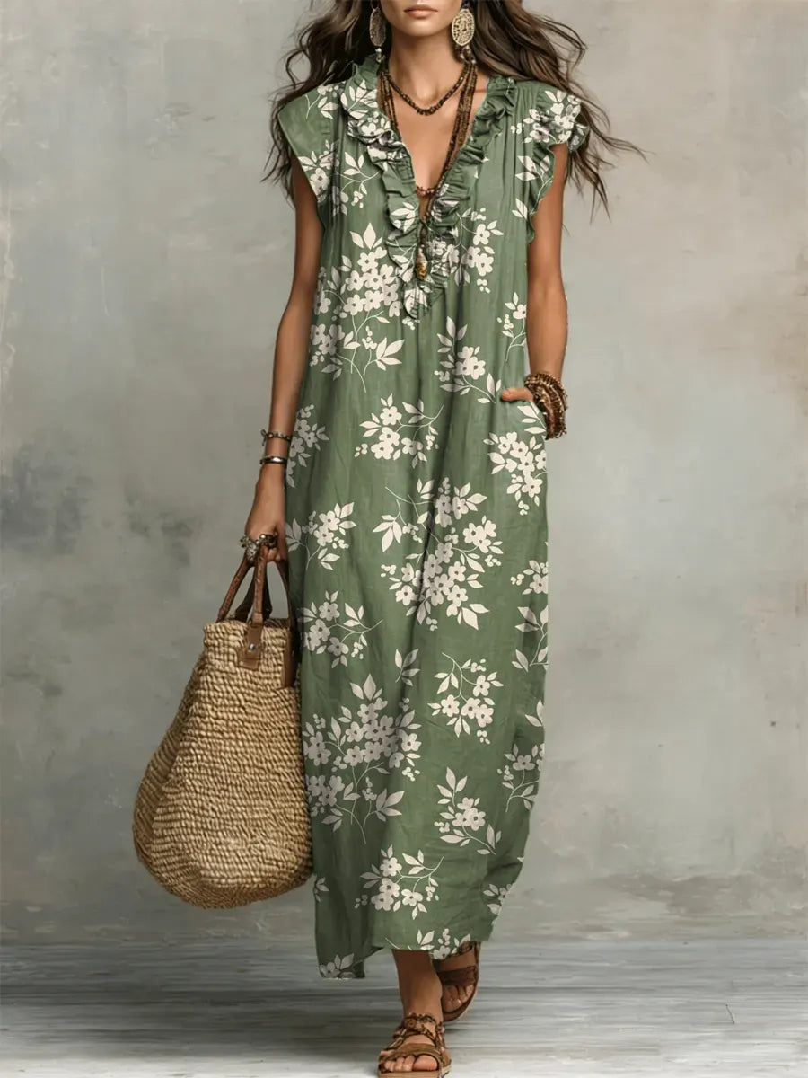 Women's Bohemia Print Casual Ruffled Stylish Cotton Linen Dress