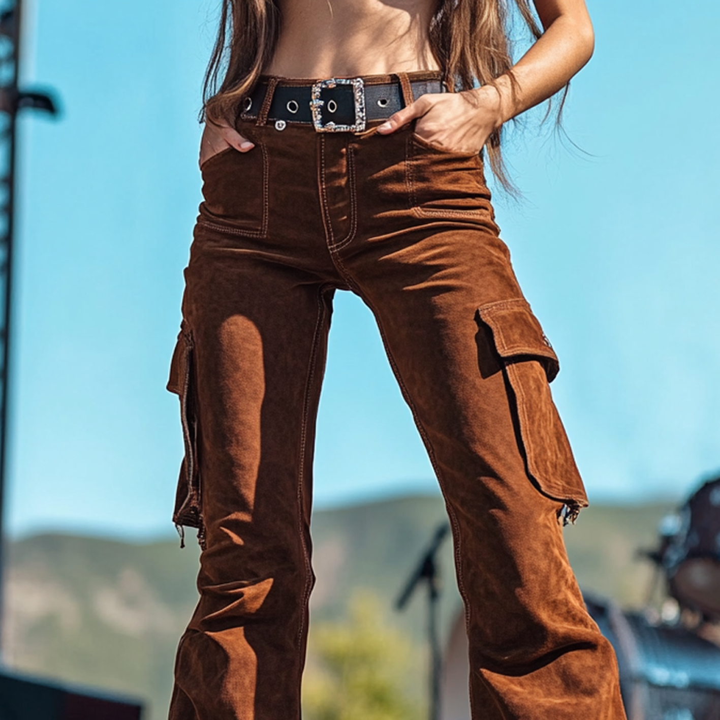 Women's Brown Corduroy Flare Pants With High Waist And Cargo Pockets
