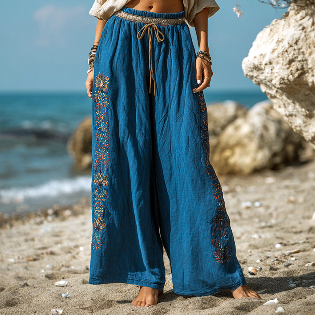 Bohemian Holiday Style Loose Casual Exquisite Embroidered Blue Beach Pants Wide-leg Pants
