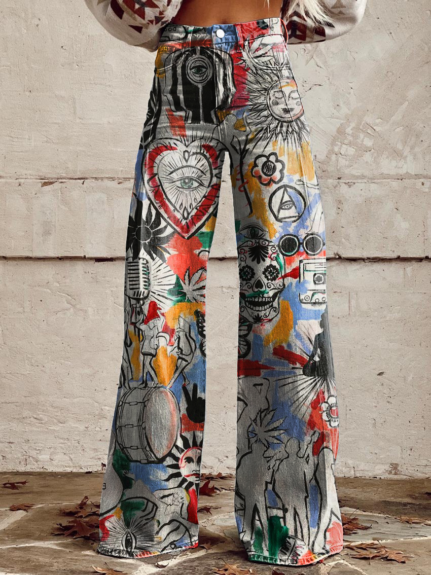 Women's Retro Hippie Graffiti Print Casual Wide Leg Pants