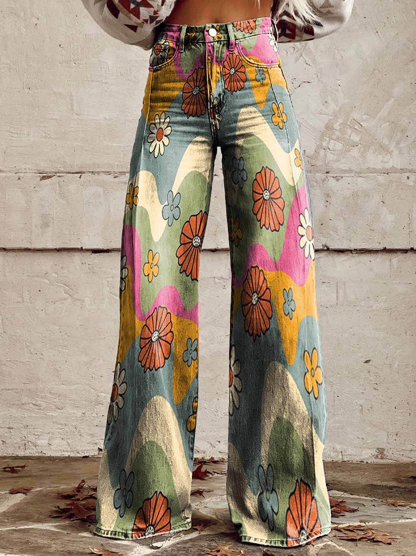 Women's Vintage Floral Daisy Print Casual Wide Leg Pants