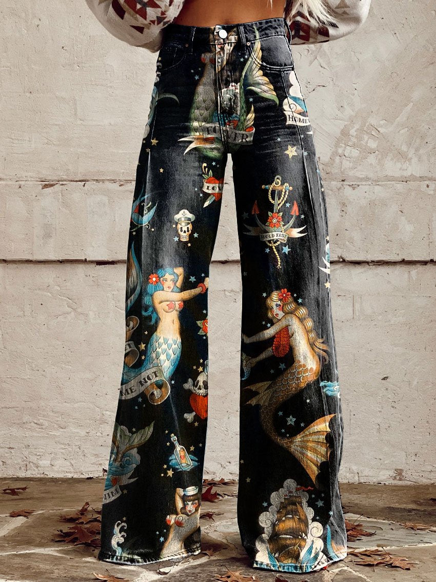Women's Vintage Mermaid Print Casual Wide Leg Pants