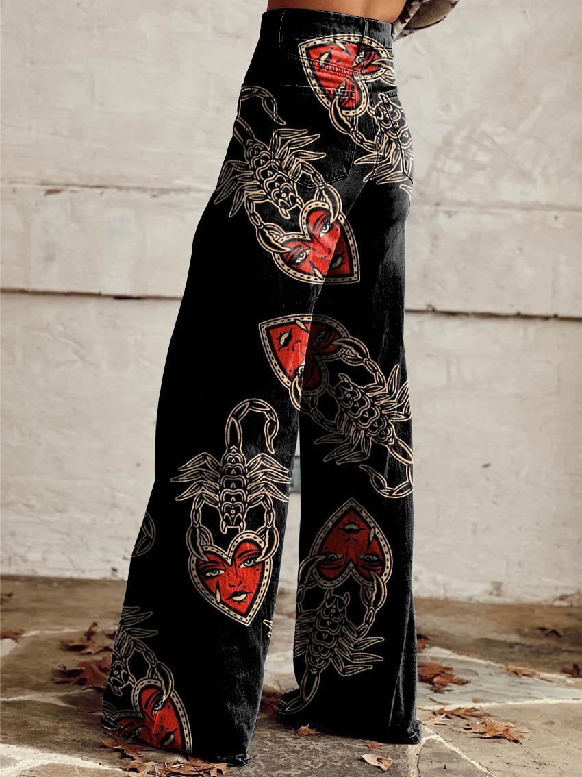 Women's Black Scorpion Heart Print Casual Wide Leg Pants