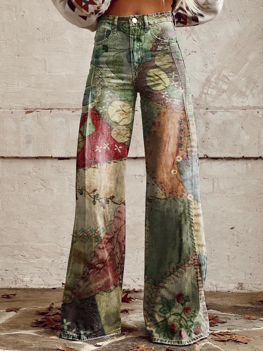 Women's Retro Floral Stitching Print Casual Wide Leg Pants
