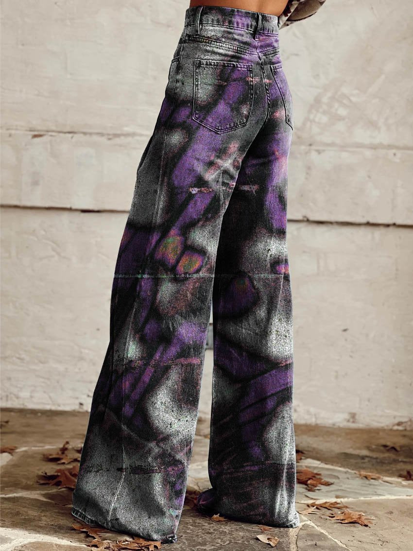 Women's Purple White Noise Print Casual Wide Leg Pants