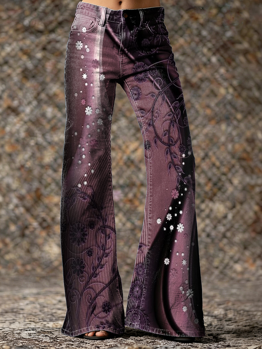 Women's Vintage Black Purple Gradient Floral Hippie Art Prints Casual Flared Pants