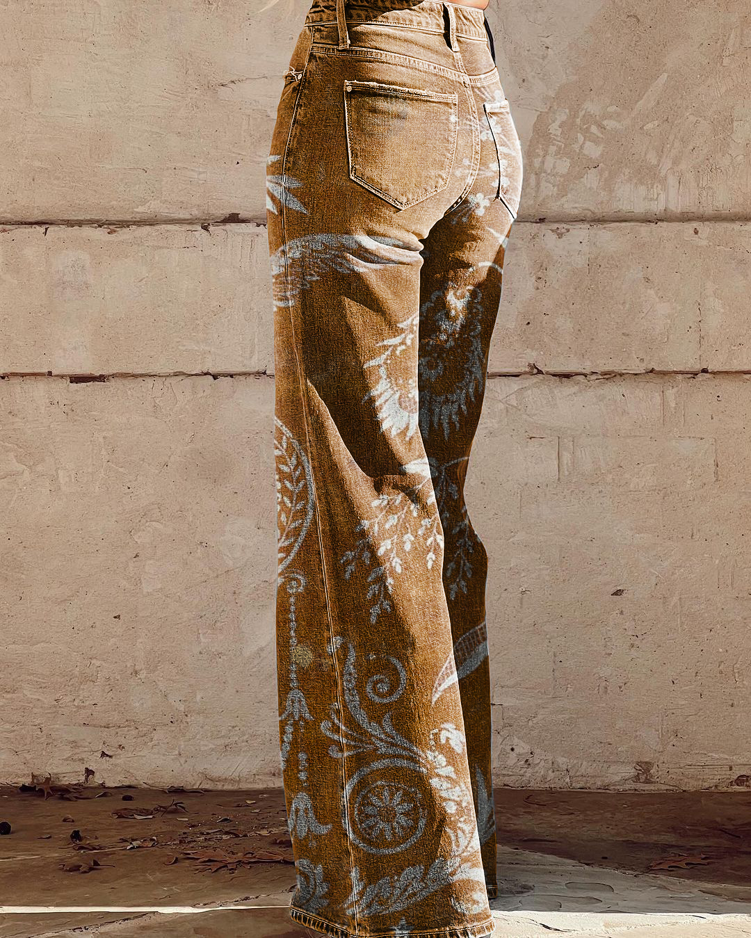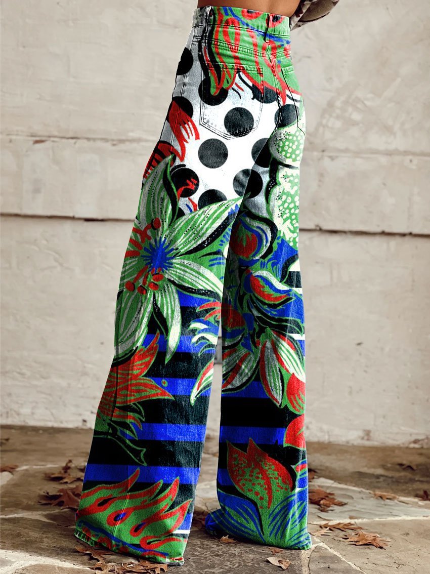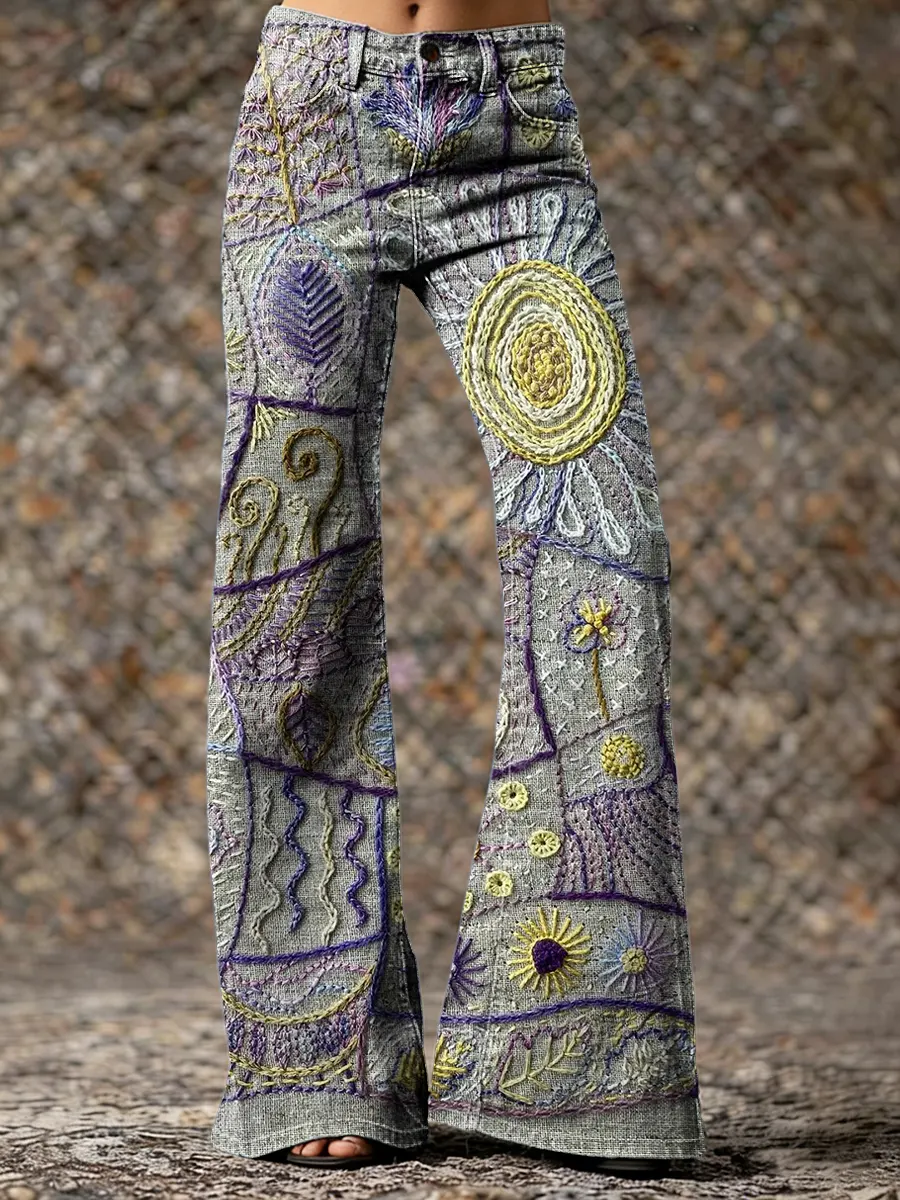 Women's Vintage Floral Patchwork Art Print Casual Washed Cotton Pants