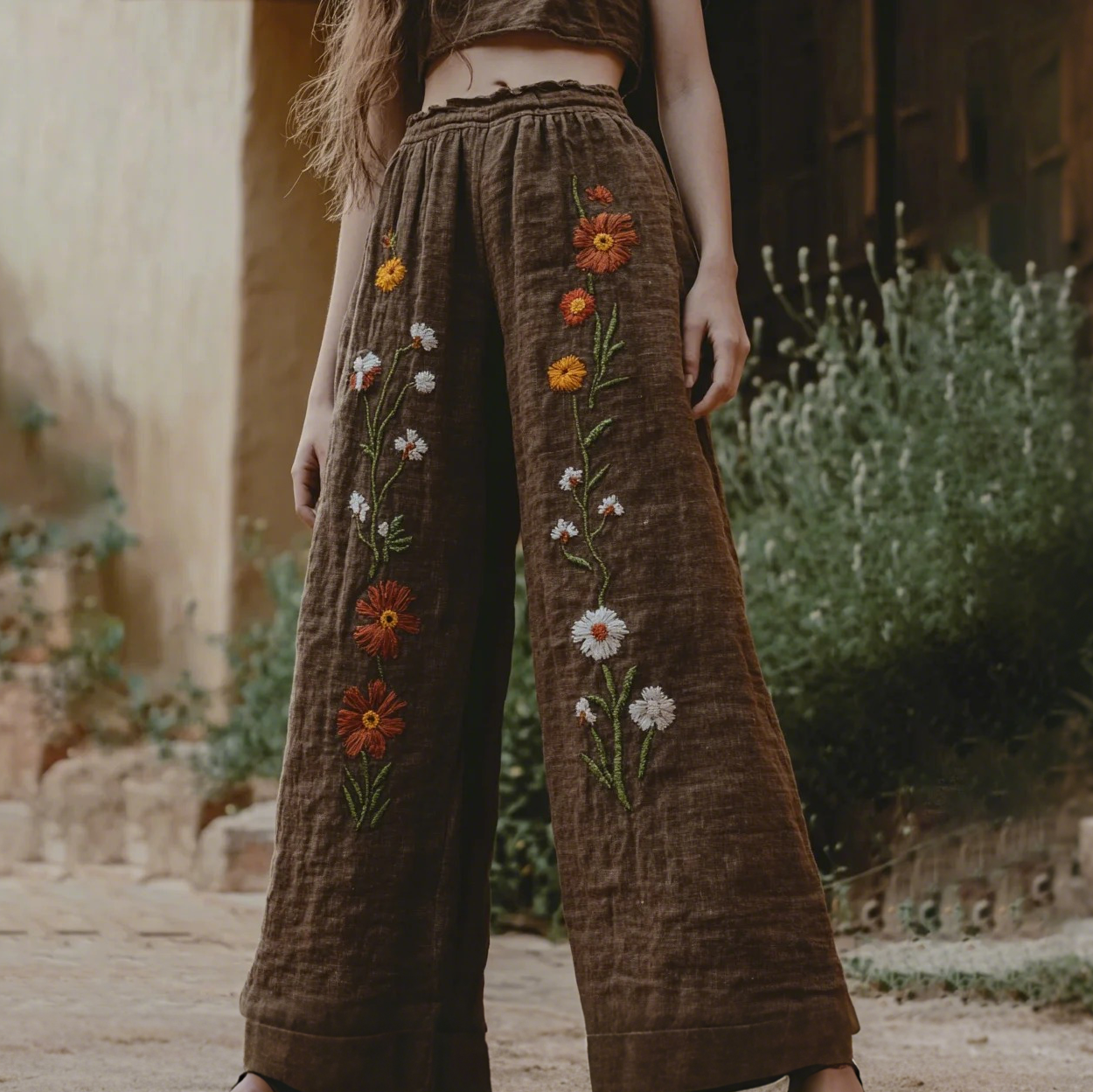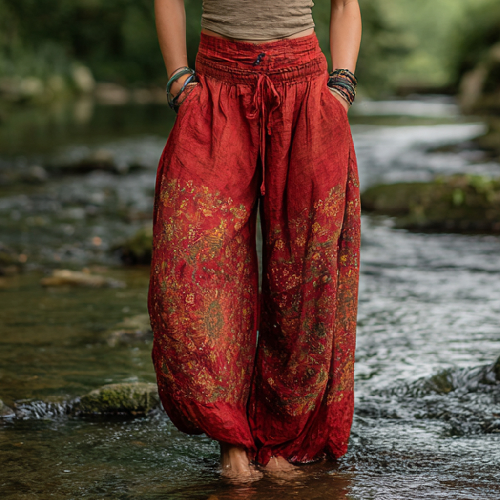 Women's Retro Linen Floral Boho Loose Wide-leg Trouser Pants