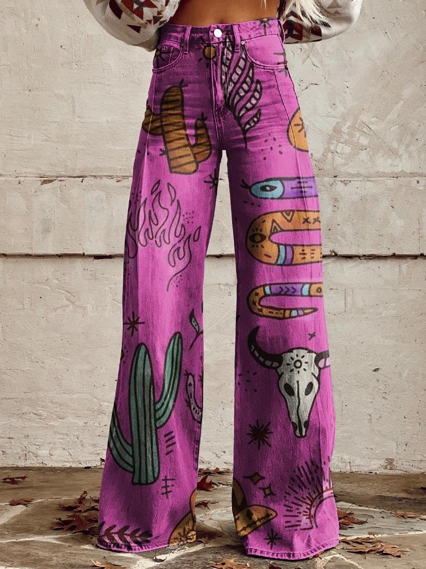 Women's Purple Western Element Print Casual Wide Leg Pants