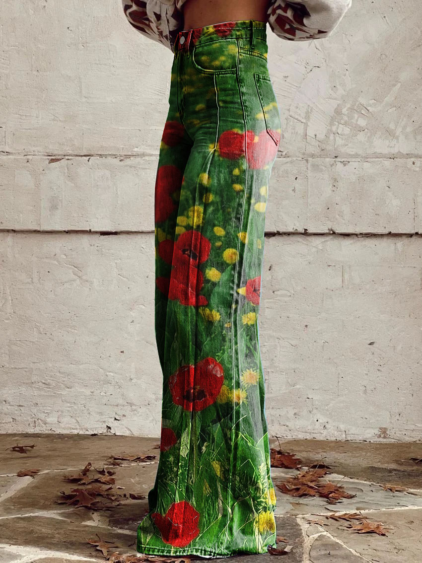 Women's Retro Poppy Print Casual Wide Leg Pants