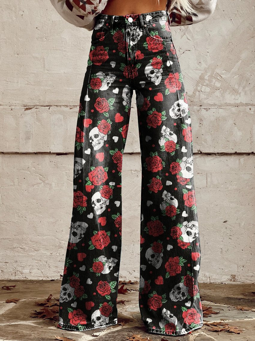 Skull Rose Print Women's Print Casual Wide Leg Pants