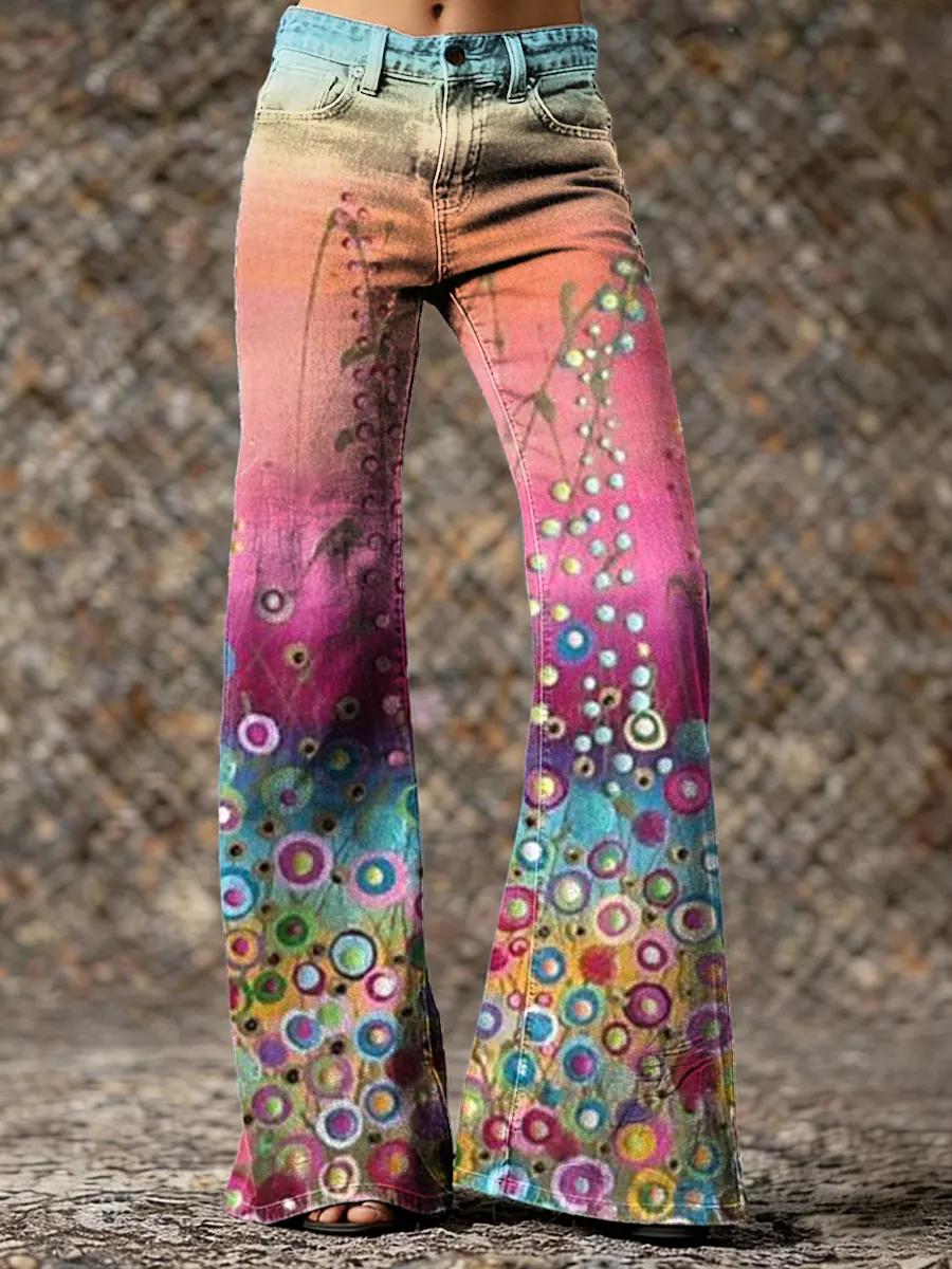 Women's Vintage Colorful Polka Dot Floral Art Print Casual Slim-fit Flared Pants