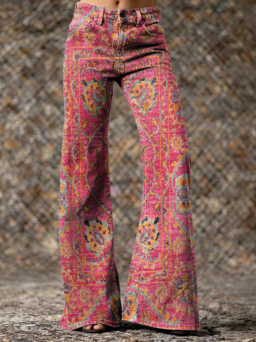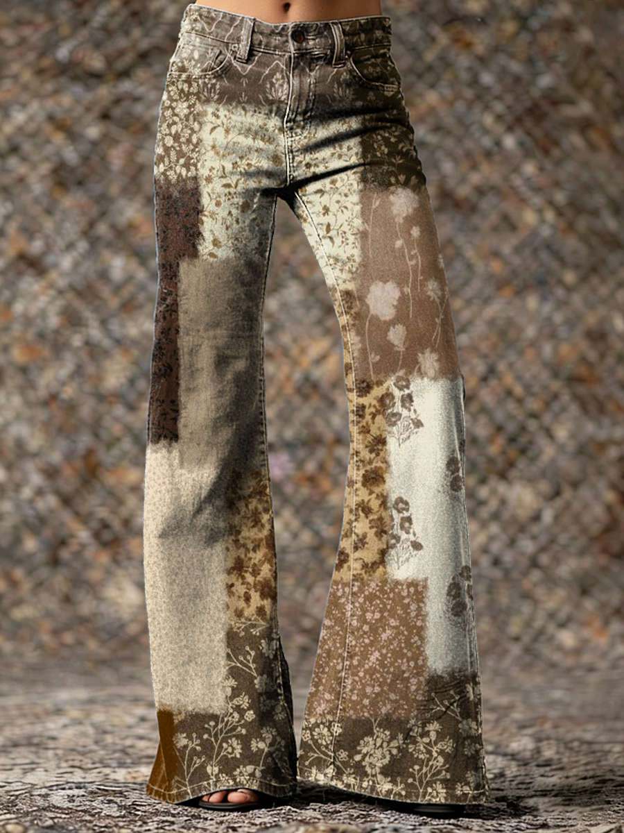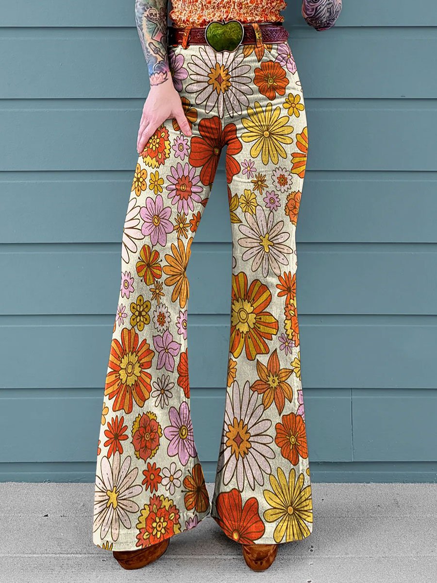 Women's Vintage Ethnic Collage Floral Hippie Art Prints Casual Flared Pants
