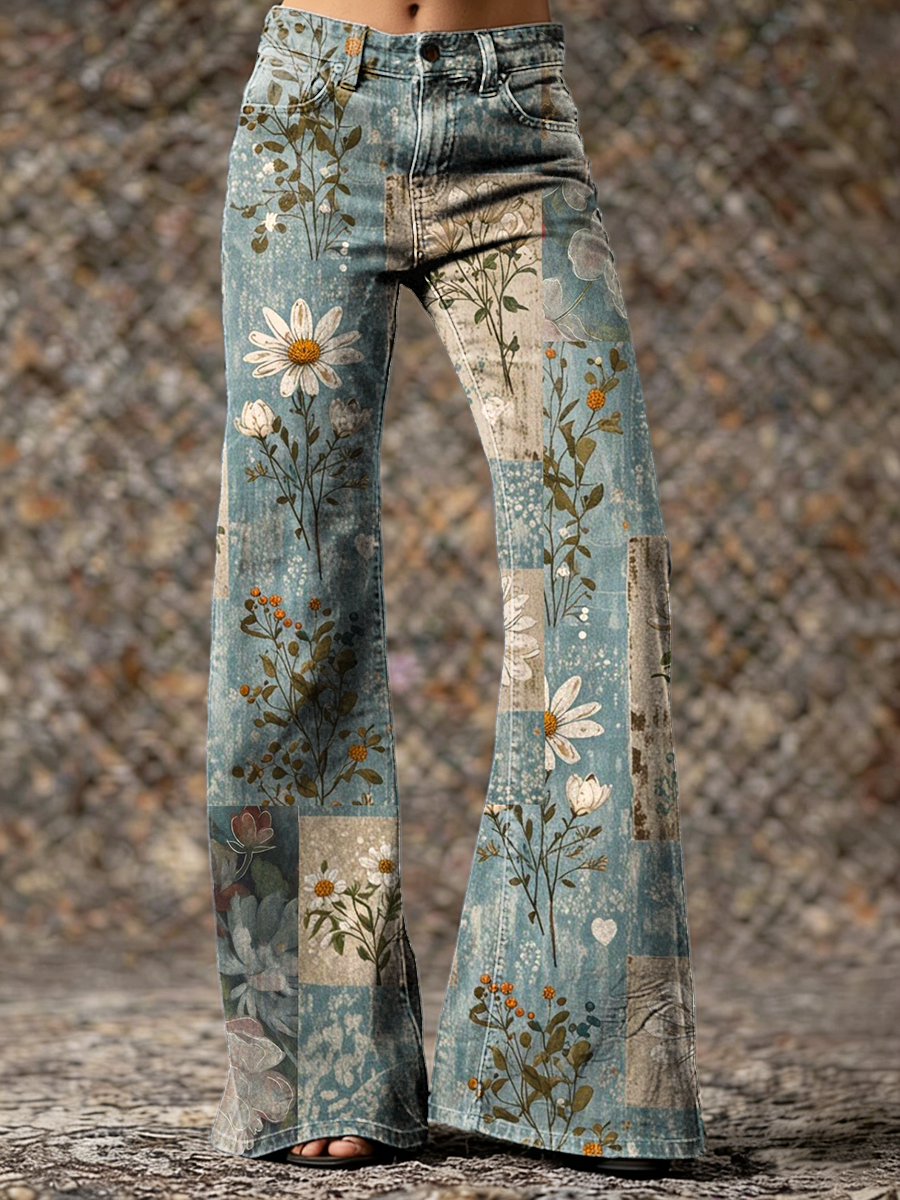 Women's Vintage Blue Collage Floral Daisy Hippie Art Printed Casual Flared Pants
