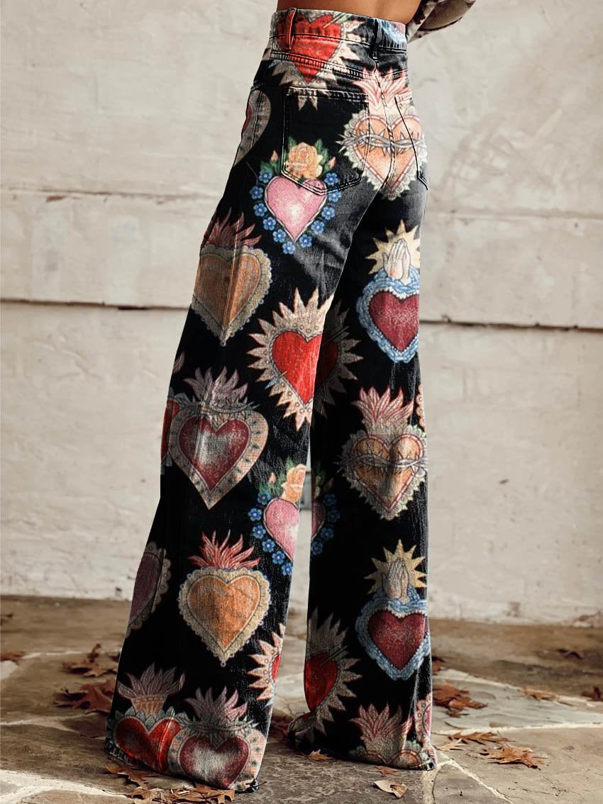 Women's Black Heart Print Casual Wide Leg Pants