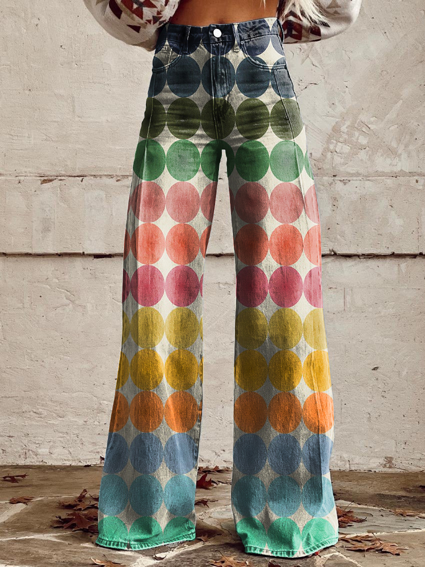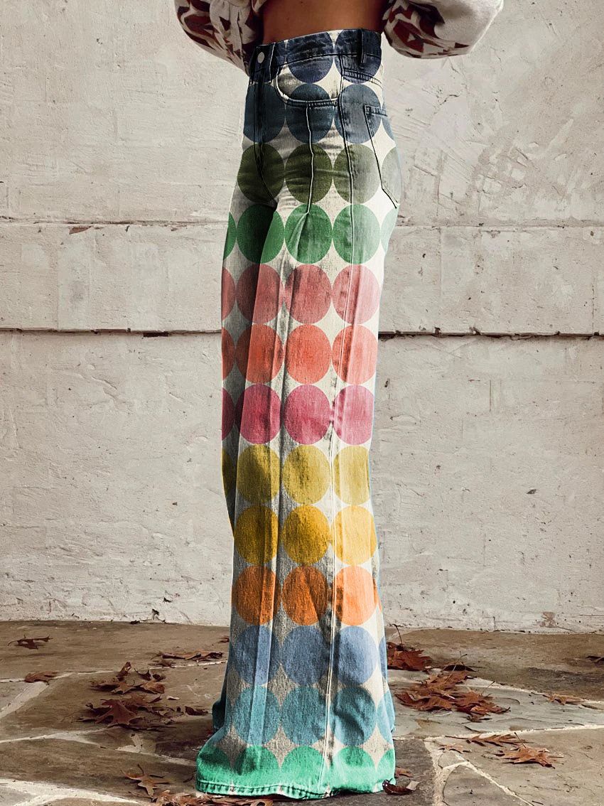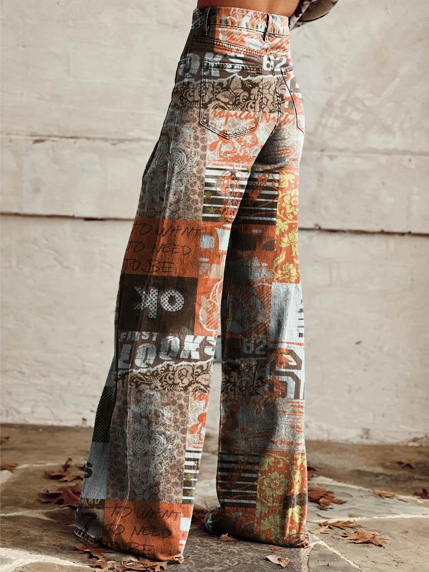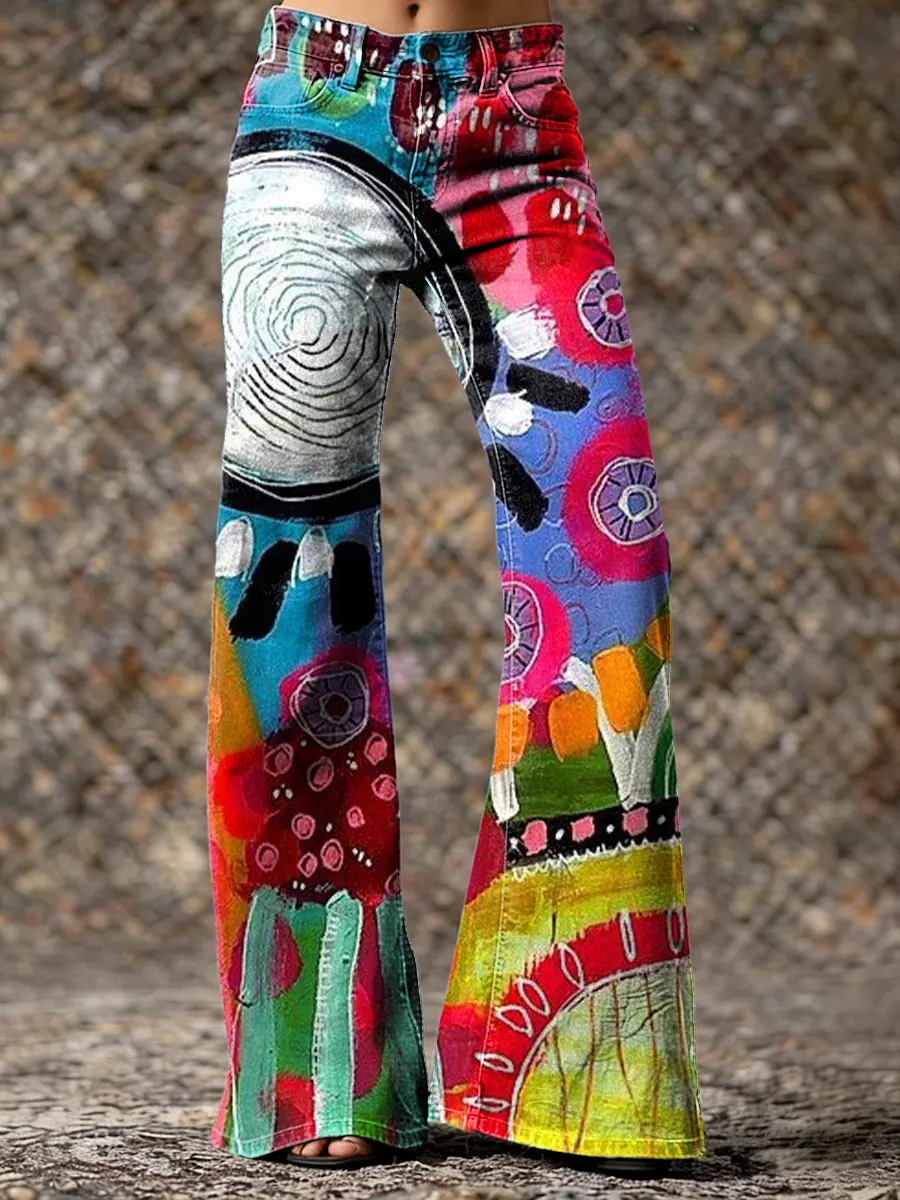 Women's Vintage Multicolor Abstract Art Print Wide Leg Pants