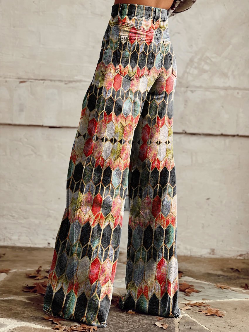 Women's Vintage Geometric Pattern Print Casual Wide Leg Pants