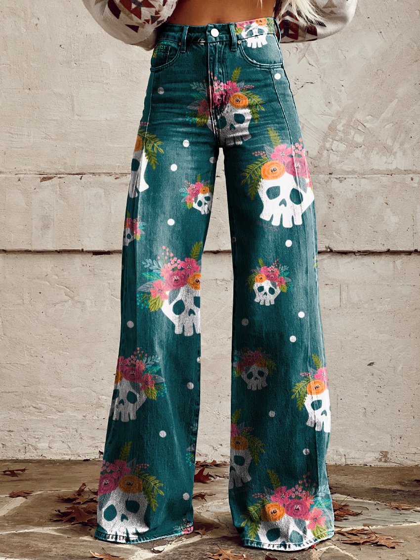 Cute Skeletal Flowers Women's Print Casual Wide Leg Pants