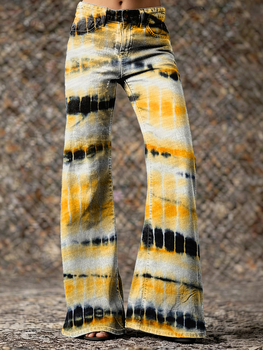 Women's Vintage Yellow Black Tie-dye Gradient Hippie Art Prints Casual Flared Pants