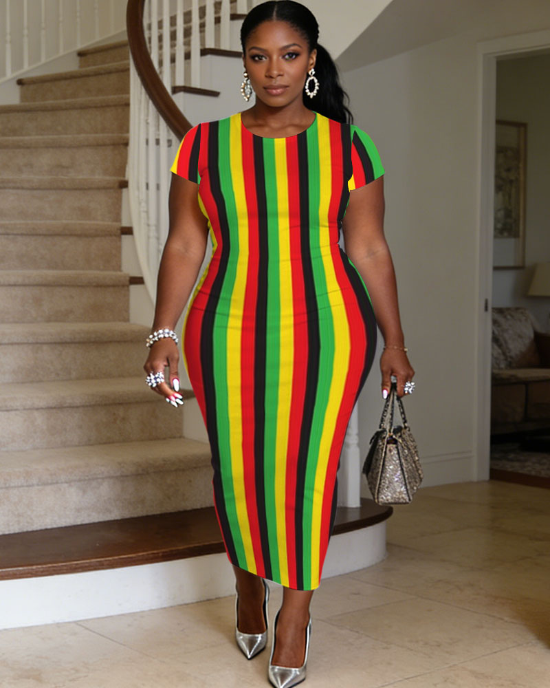 African Classic Kent Reggae Color Print Women's Round Neck Short Sleeve Dress