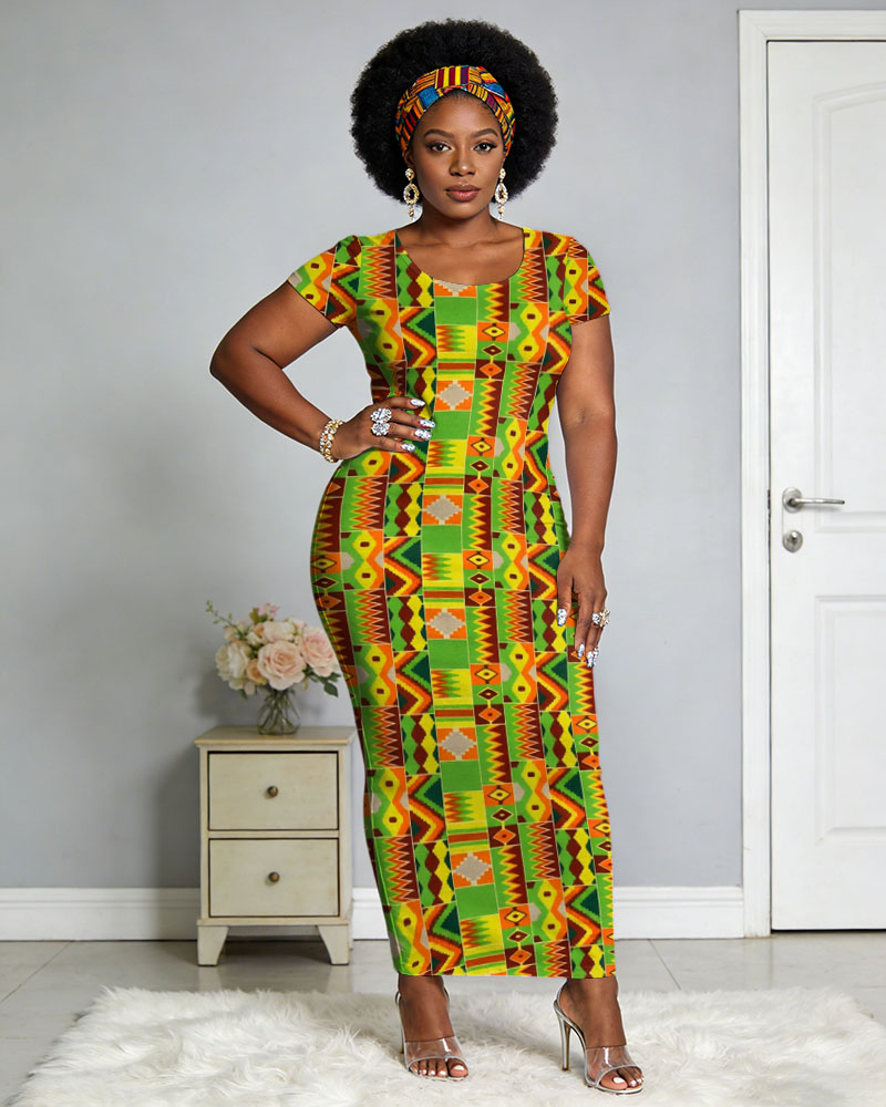 African Kent Cloth Traditional Floral Print Women's Slim-fit Round Neck Long Dress