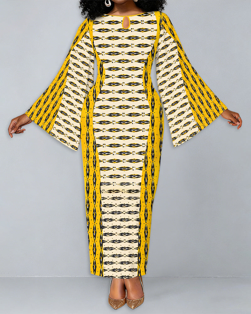 Ankara Color Blocking Print Patchwork Round Neck Bell Sleeve Bodycon Long Dress