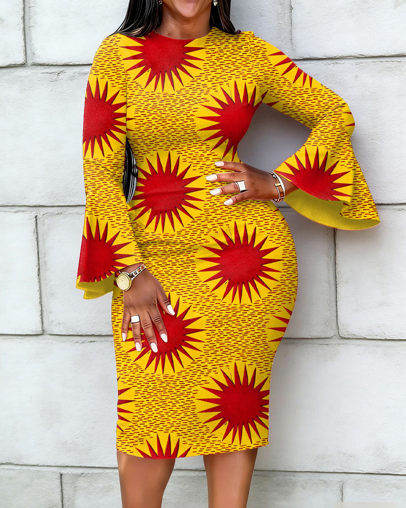 Ankara Red Sun Texture Prints Flared Sleeves Mini Dresses