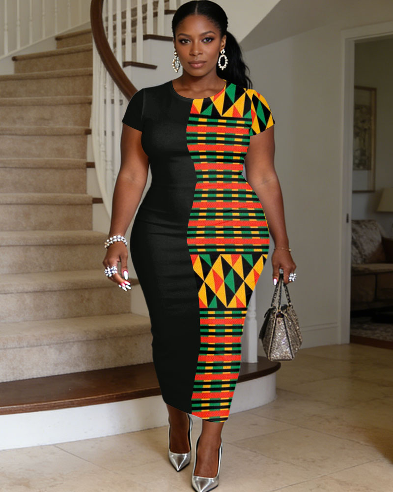 Black Patchwork Kent Cloth Print Women's Round Neck Short Sleeve Dress
