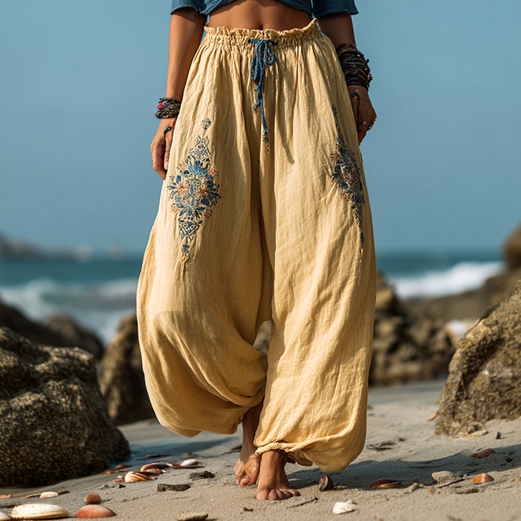 • Design Elements: Intricate Floral Embroidery, Adjustable Drawstring Waist, Loose Fit