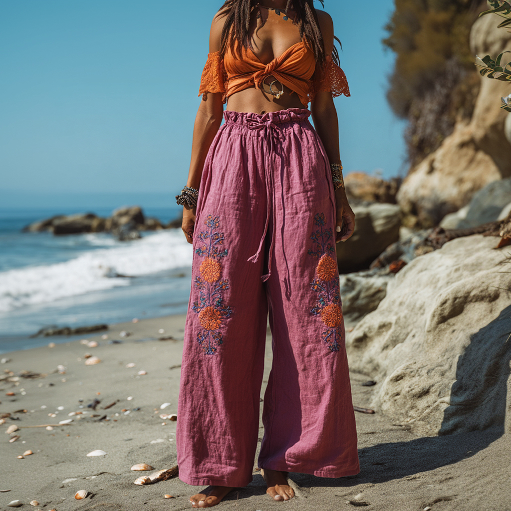 • Design Elements: High-waisted with drawstring, floral embroidery on the sides, loose fit