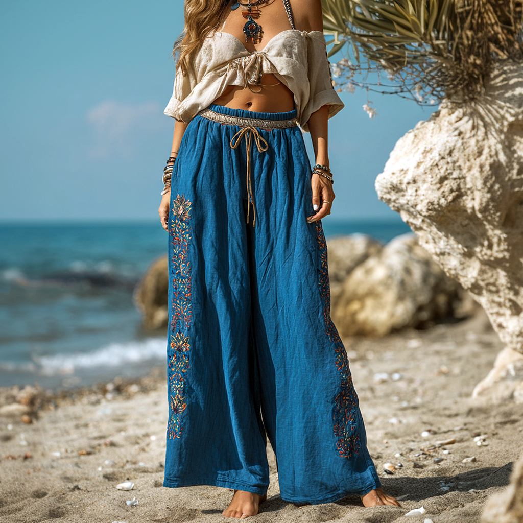 • Design Elements: Intricate floral embroidery along the sides, adjustable drawstring waist, relaxed fit