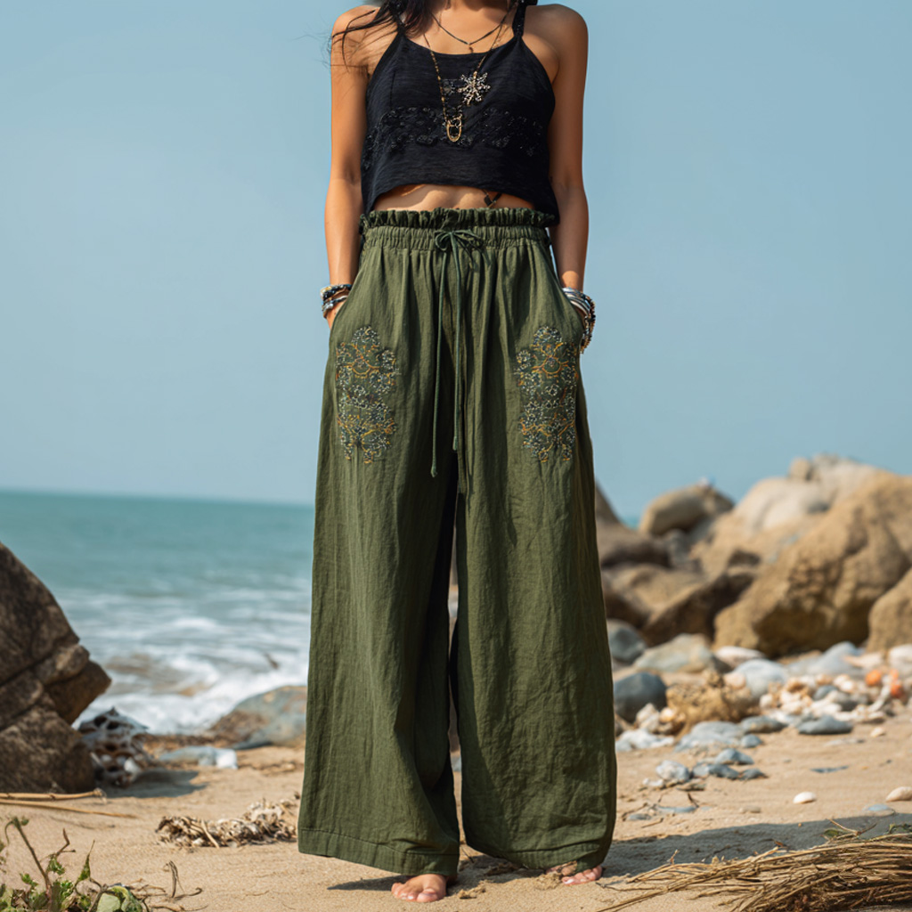 • Design Elements: Embroidered Floral Patterns on Legs, Elastic Waistband with Drawstring, Loose Fit