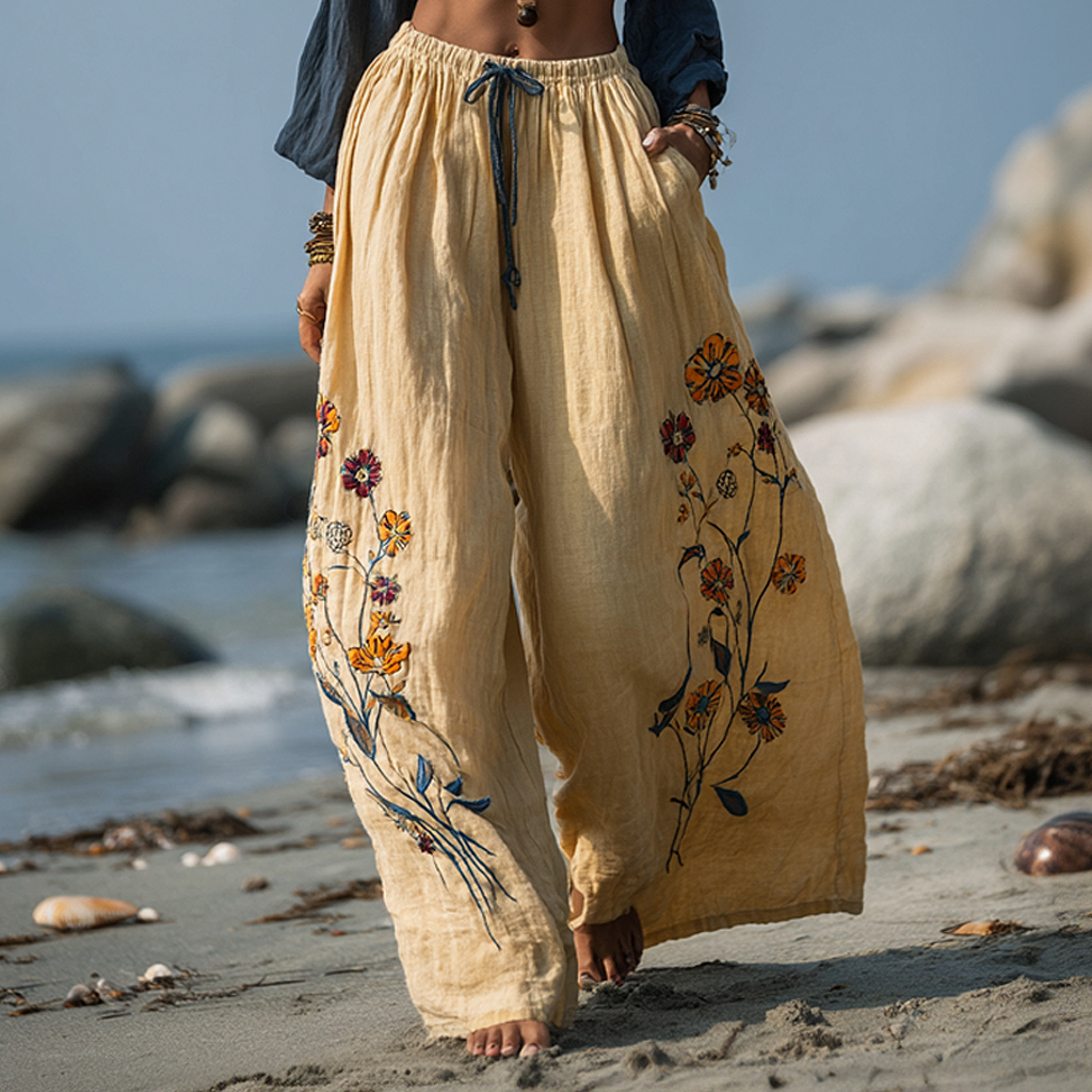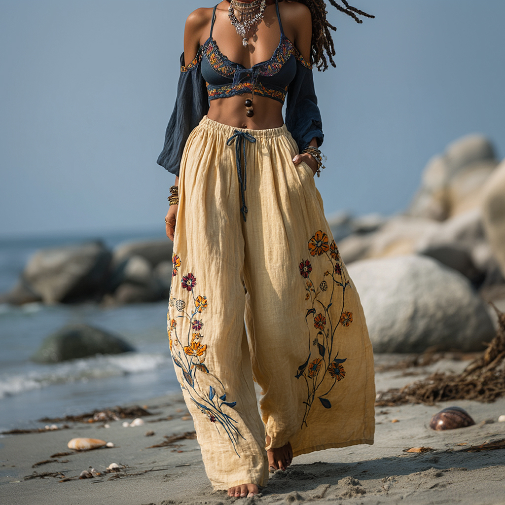 • Design Elements: Vibrant floral embroidery, adjustable drawstring waist, loose fit