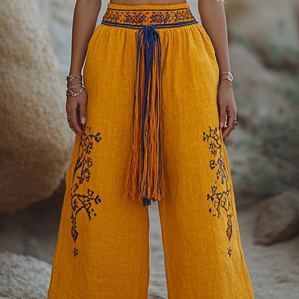 • Design Elements: Intricate Embroidery on Legs, Vibrant Tassel Accent at Waist, Elastic Waistband for Comfort