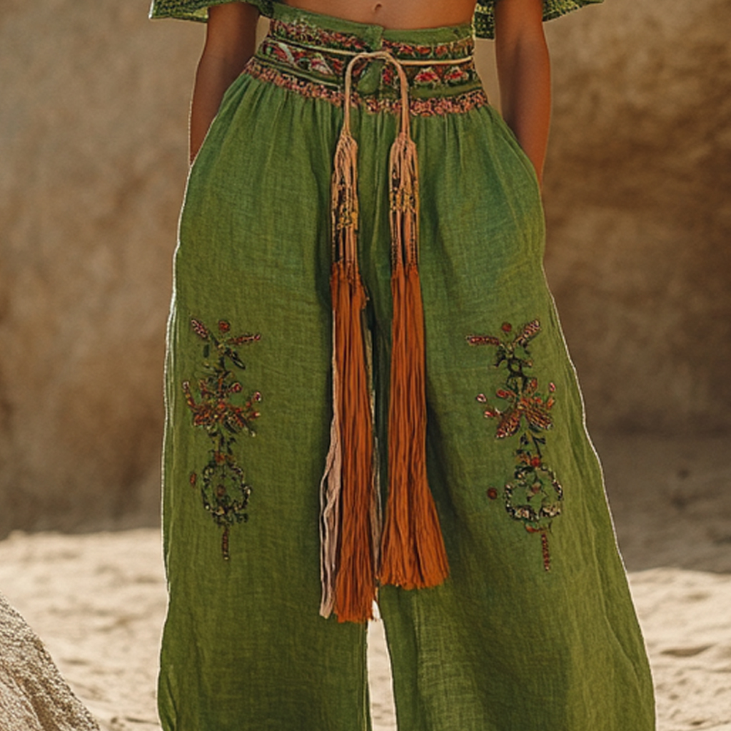 • Design Elements: Intricate Floral Embroidery, Adjustable Tassel Waistband