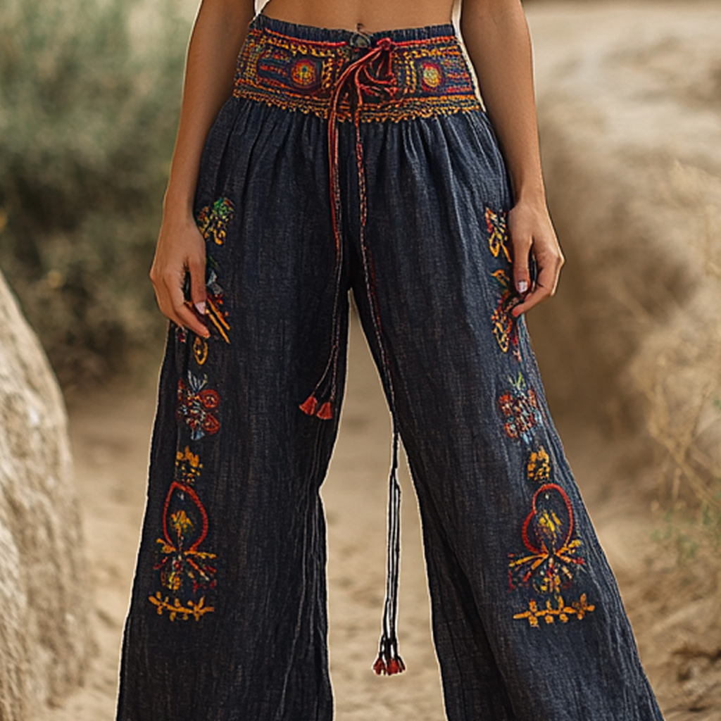 • Detail Features: Adjustable drawstring waistband, vibrant floral embroidery, decorative tassels