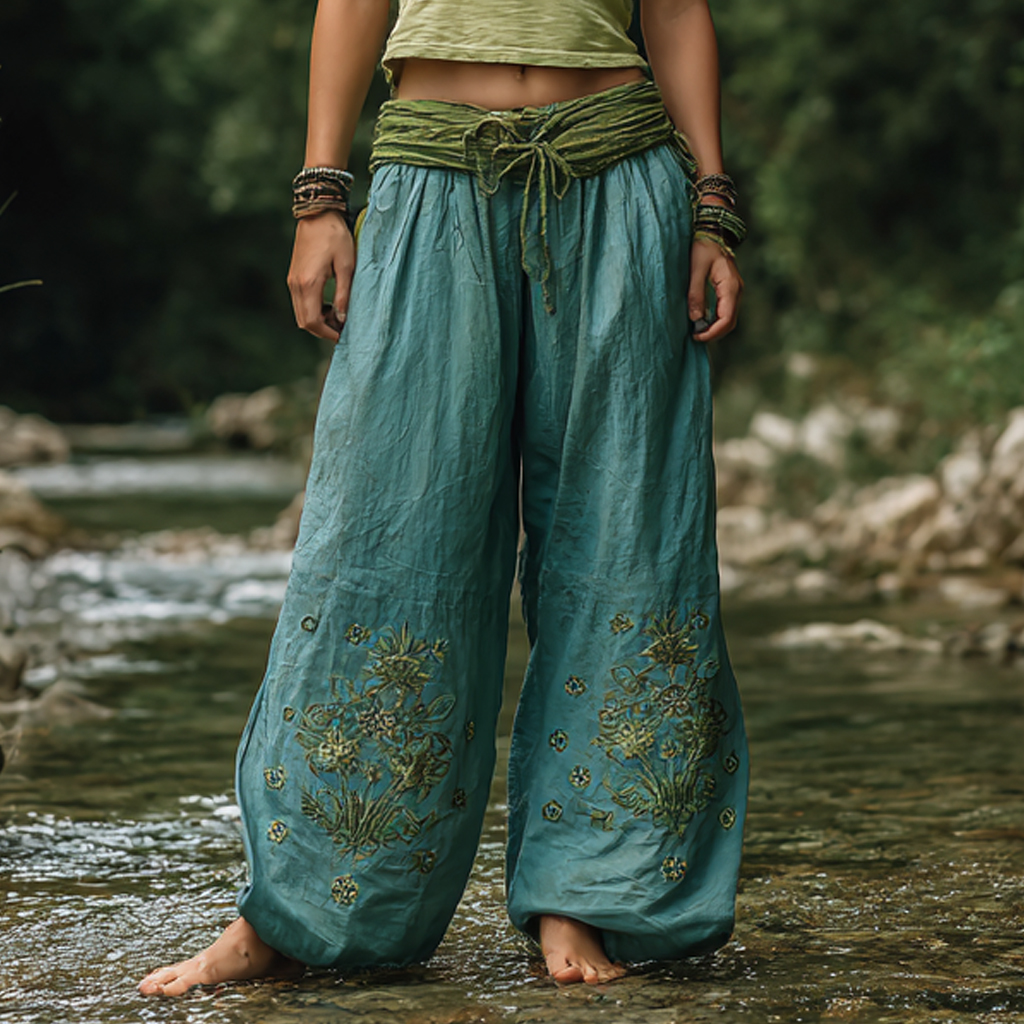 • Design Elements: Intricate floral embroidery, adjustable waist tie, relaxed fit