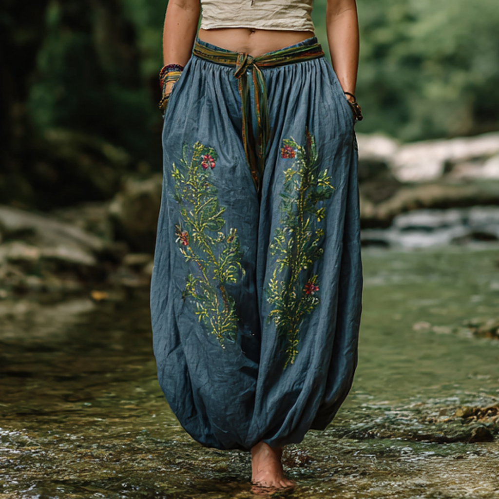• Design Elements: Intricate floral embroidery, adjustable waist tie