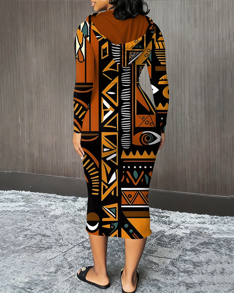 Classic Black Cultural Tribal Totems Print Hooded Dress