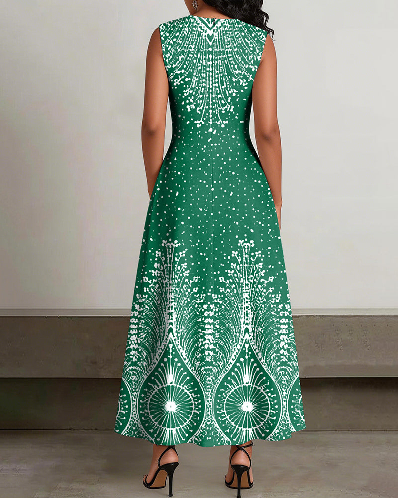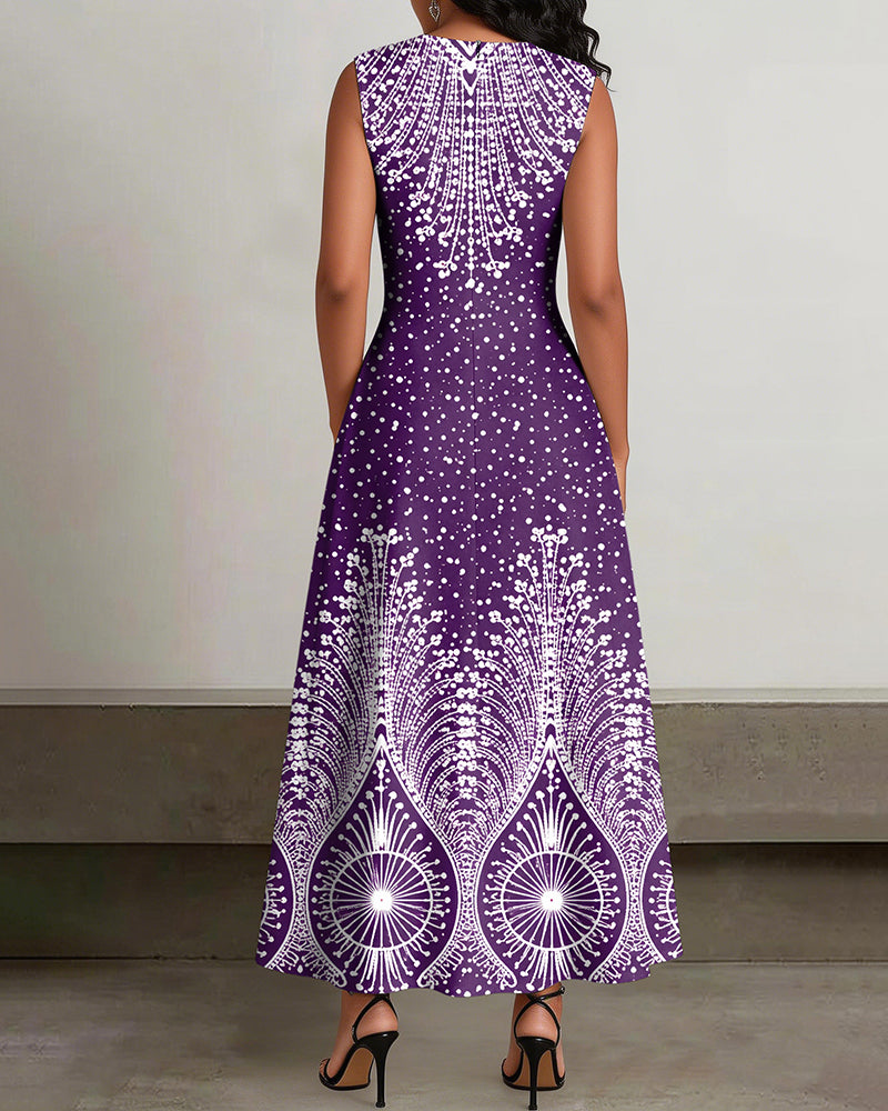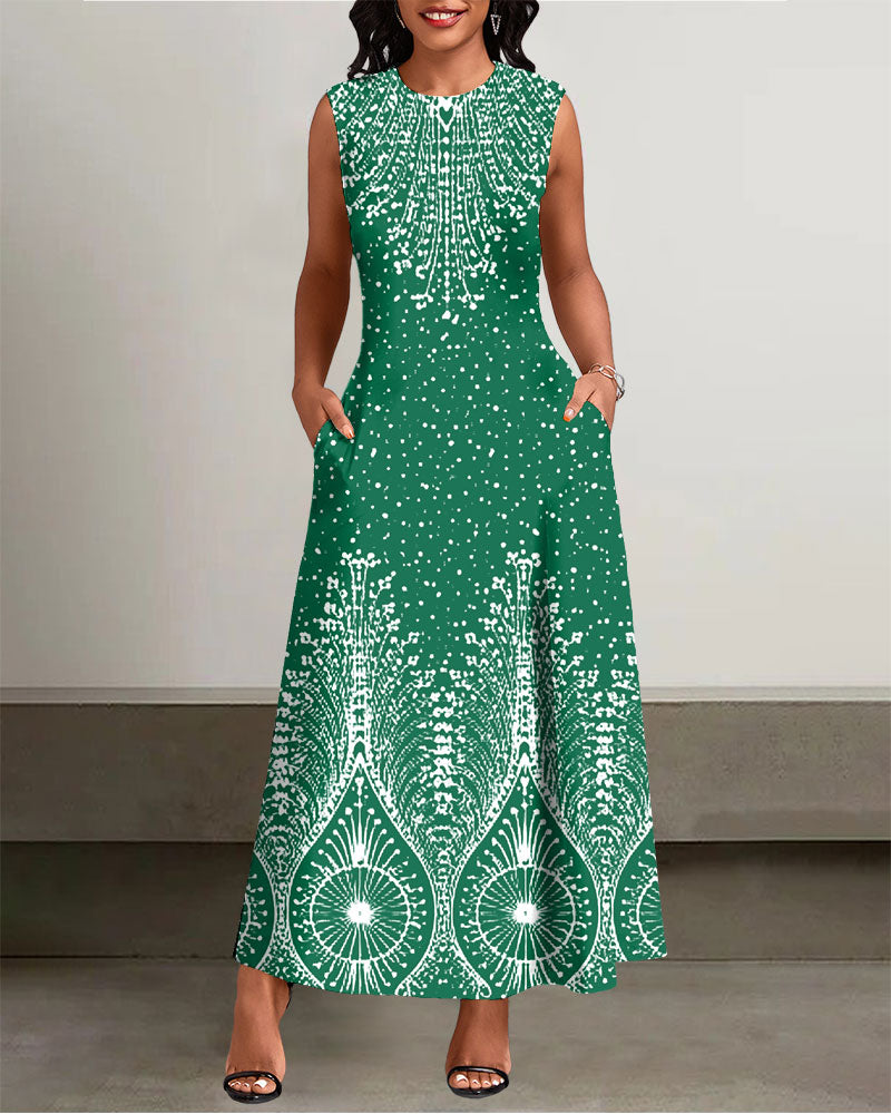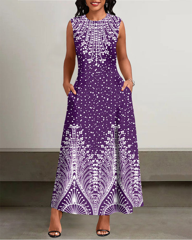 Crew Neck Fun Geometric Polka Dot Print Sleeveless Pockets Maxi Dress
