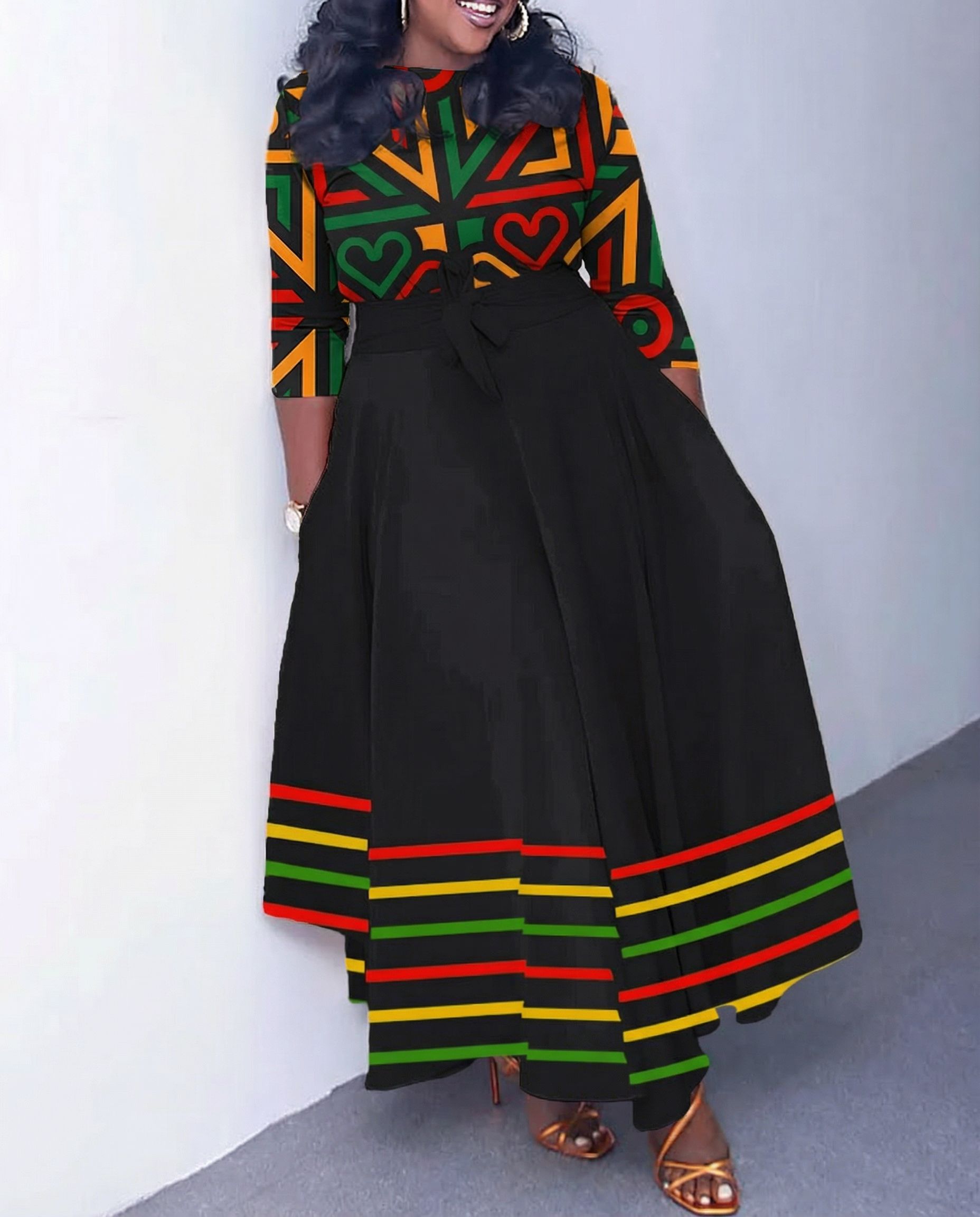 Crew Neck Reggae African Color Elements Straps Pockets Maxi Dress