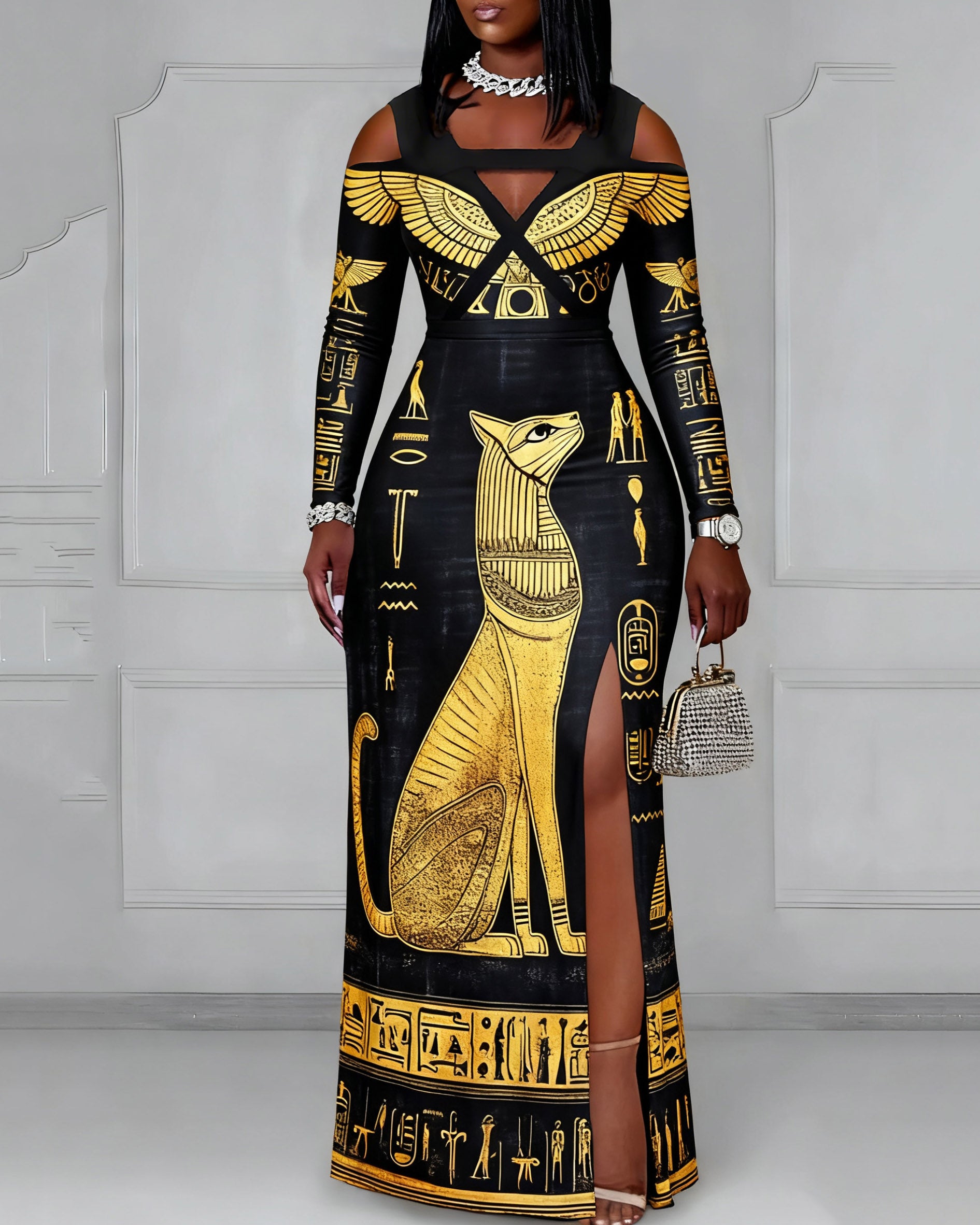 Cutout Off-shoulder V-neck Black Culture Wolf Totem Long Sleeve Bodycon Party Dress
