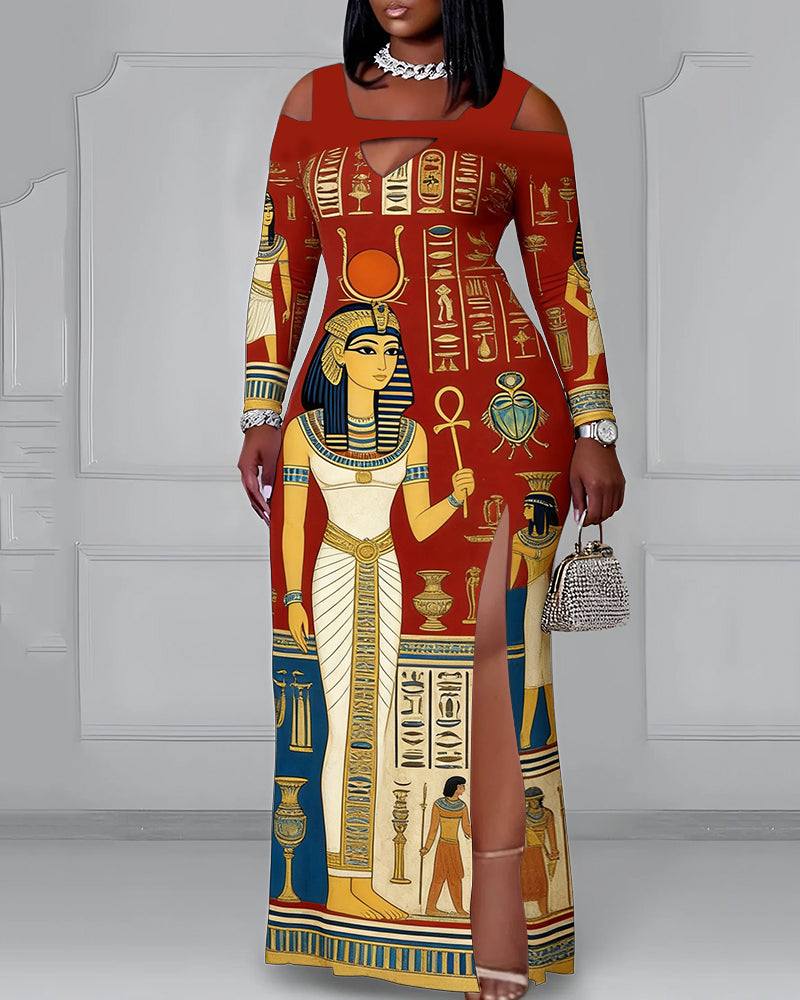 Cutout Off-shoulder V-neck Egyptian Goddess Totem Prints Long Sleeve Bodycon Dress