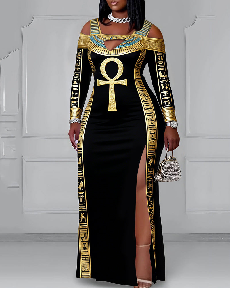 Cutout Off-shoulder V-neck Egyptian Gold Striped Cross Long Sleeve Bodycon Dress