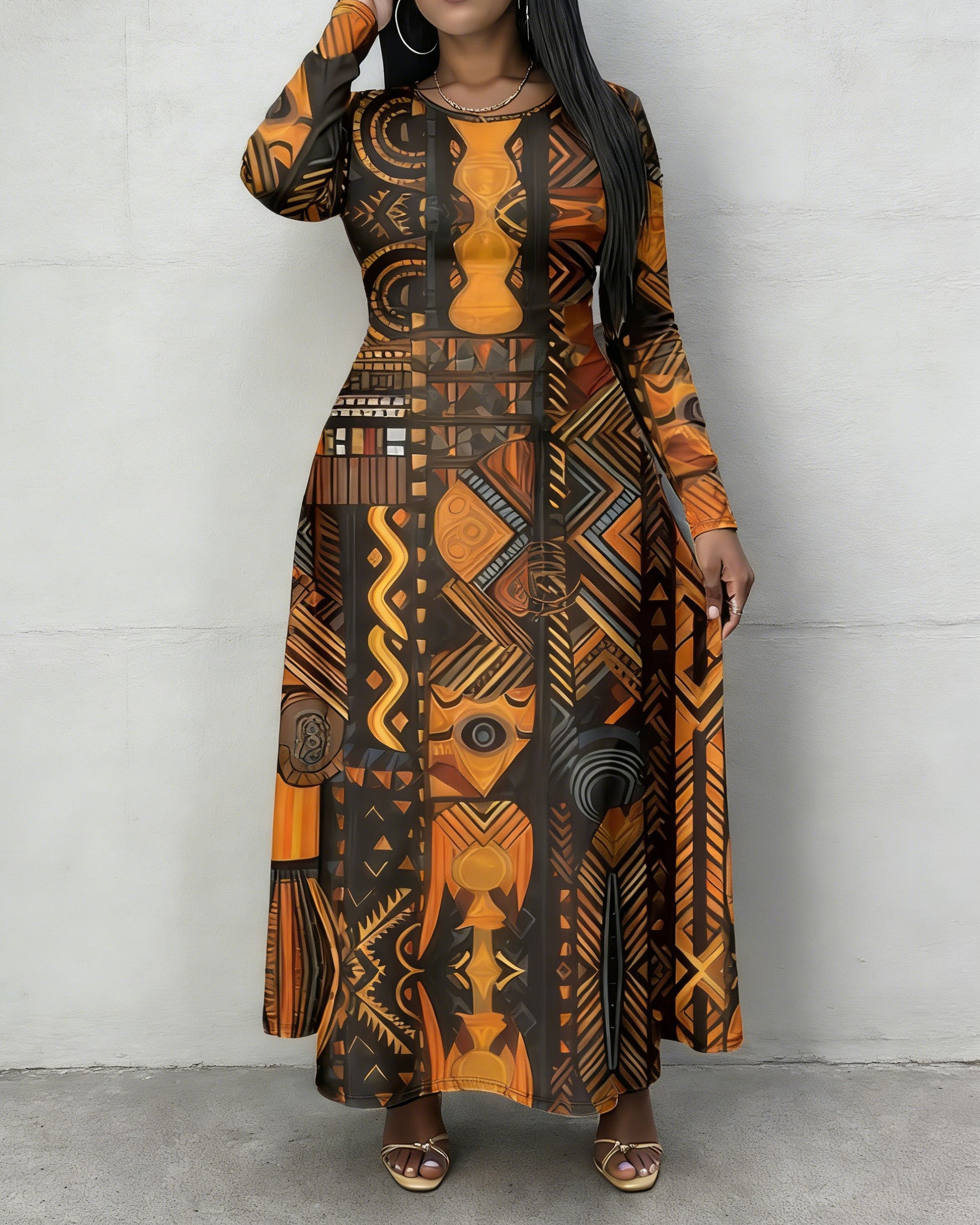 Geometric Totem Tribal Prints Crewneck Long Sleeve Pocket Dress