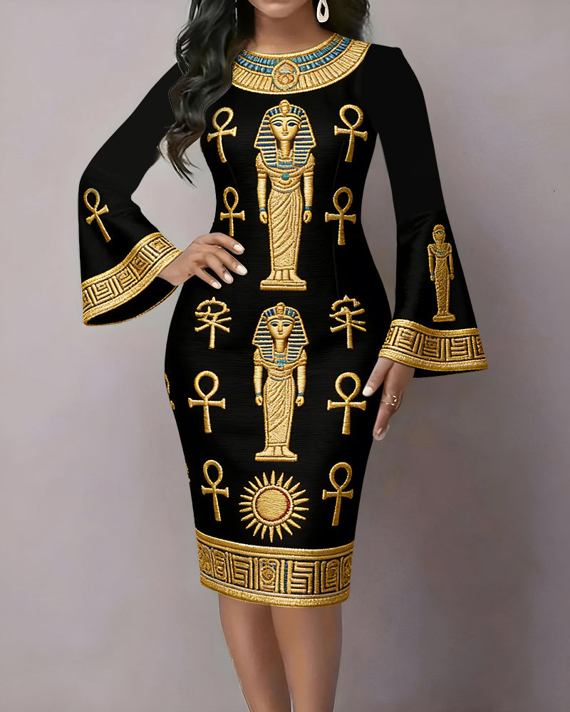 Golden Egyptian God Cross Flared Sleeves Mini Dresses