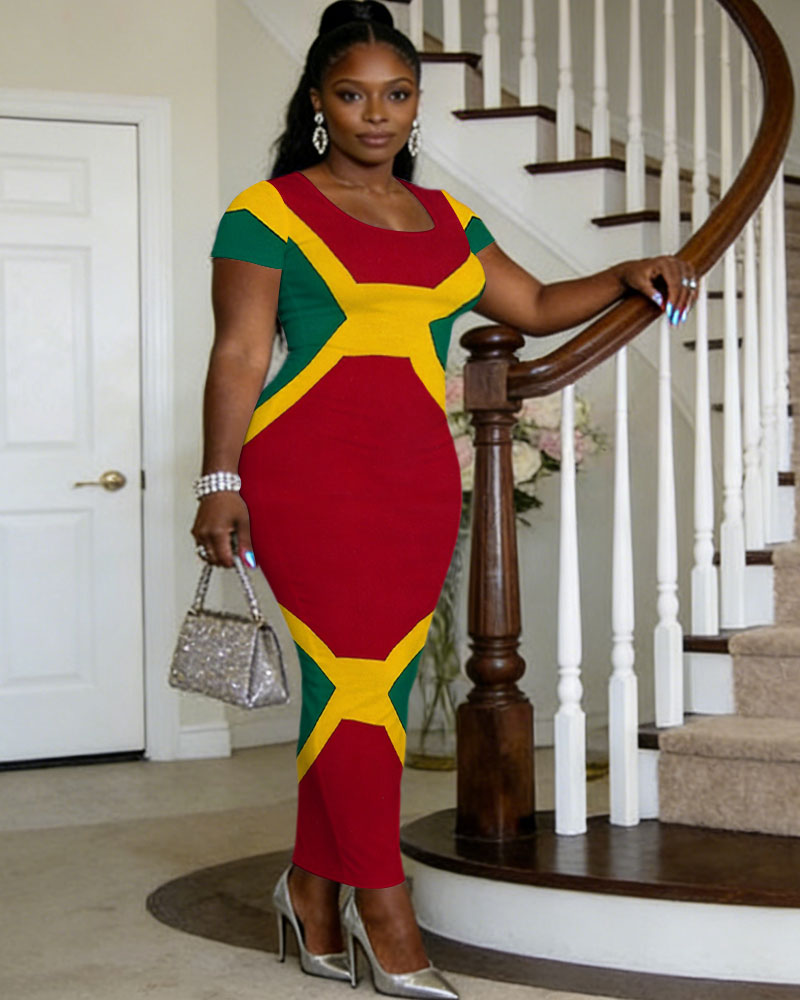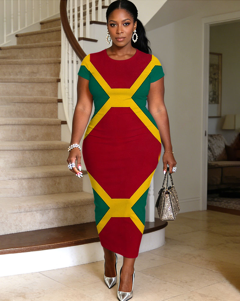 Large Geometric Color Slim Hip Printed Women's Round Neck Short Sleeve Dress