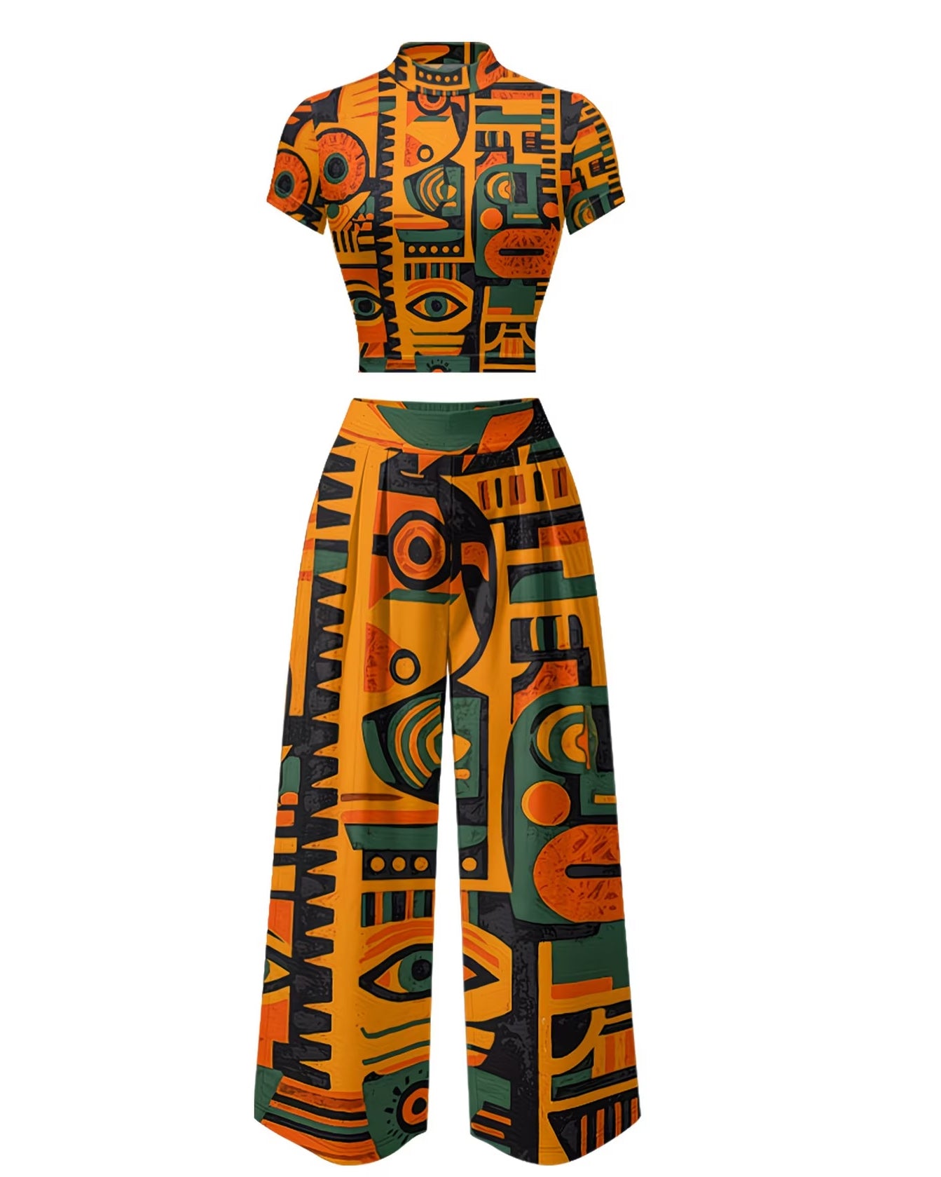 Orange African Traditional Print High Waist Wide-leg Women's Two-piece Set