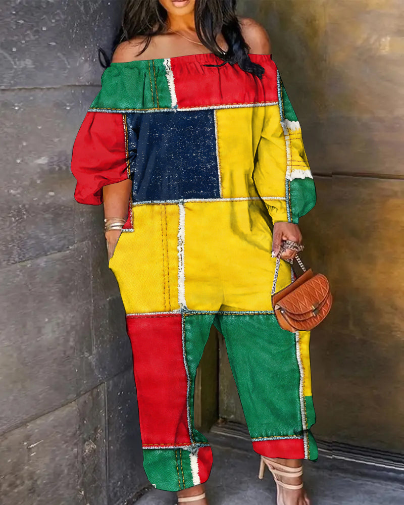 Reggae Block Patch Stickers Off The Shoulder Pocket Jumpsuit